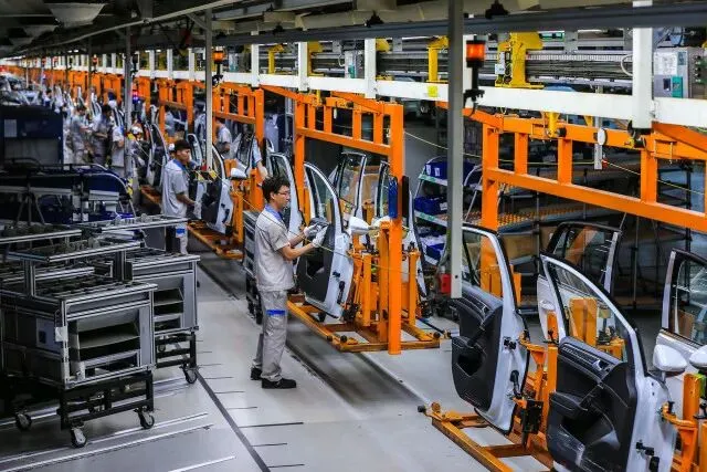 随后我们来到总装车间,总装车间内的工人相对较多。在由可升降电动吊具组成的生产线两侧,工人们负责将座椅、中控台、轮胎安装至车身上。