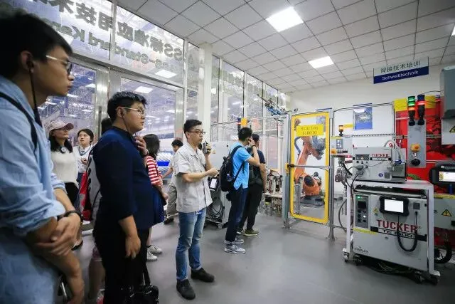 随后,厂方工程师带领我们走入了一个位于生产线旁边的培训练习车间,在这里,工程师向我们展示了焊装车间的三类主要机器人的操控方法,以及如何通过系统编程操作机器人完成一系列动作。