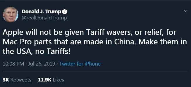 当地时间26日上午10点,特朗普通过社交媒体发声,“苹果在中国生产Mac Pro的零件,不会得到关税豁免、减免。在美国造,就不用关税!”