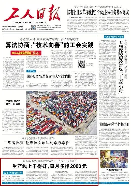 不看文凭看水平,不论资历论能力;车间主任从一线选拔,拔尖人才每月最高补贴2000元;一项工艺革新,年节省成本300万元……在辽宁大连九成船舶重工舵轴有限公司(以下简称九成舵轴),如今,一场围绕产业工人队伍建设改革的实践,正激发出前所未有的活力与创造力。这家有着400多名员工的民营企业,用一套“组合拳”,打通产业工人成长成才通道,让“工匠”真正香起来、稳下来。