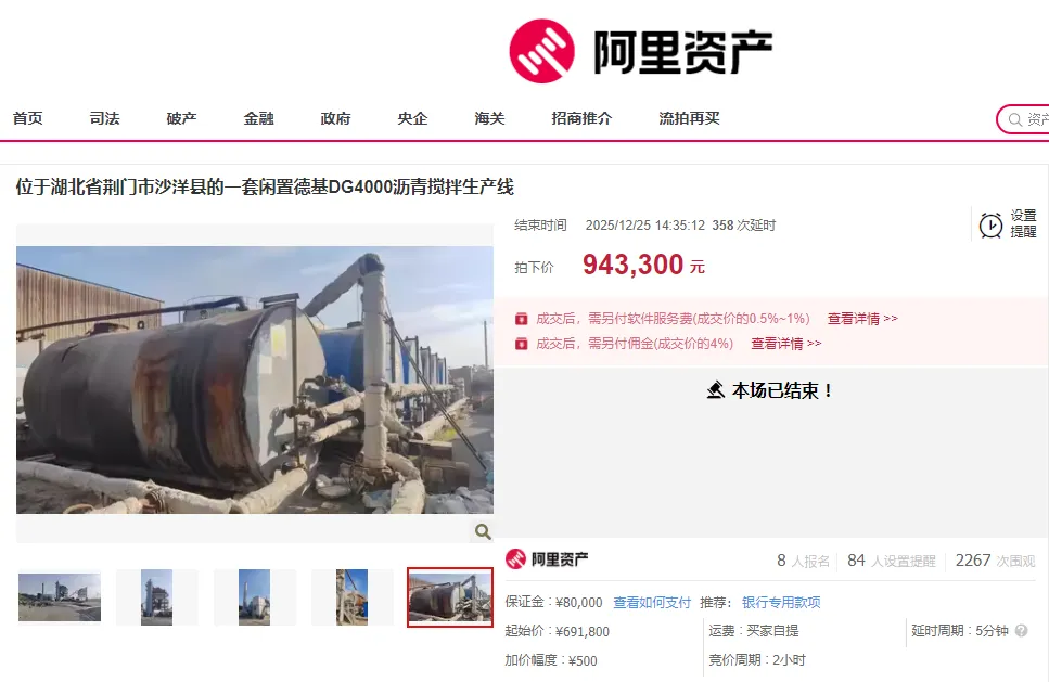 本次拍卖的 德基DG4000沥青搅拌生产线,位于湖北省荆门市沙洋县,自上线以来便引发广泛关注。经过 365轮 激烈出价、358次 激烈延时,最终在今日下午以 943,300元 圆满落槌!