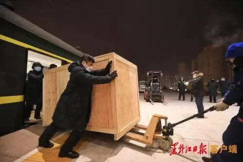 在哈尔滨西站站台上,记者看到,20余名铁路人员紧张而熟练地将分解的口罩生产线机器从列车行李车厢卸下,装载到旁边的货车上。