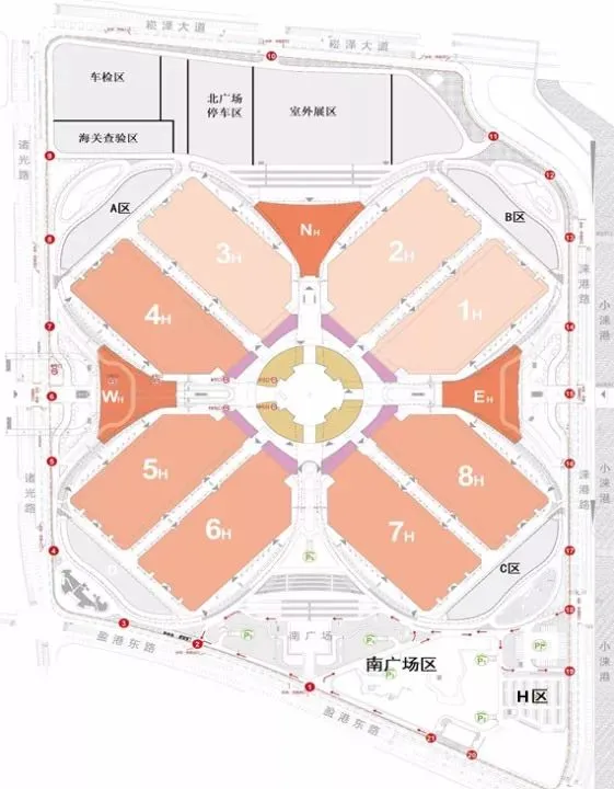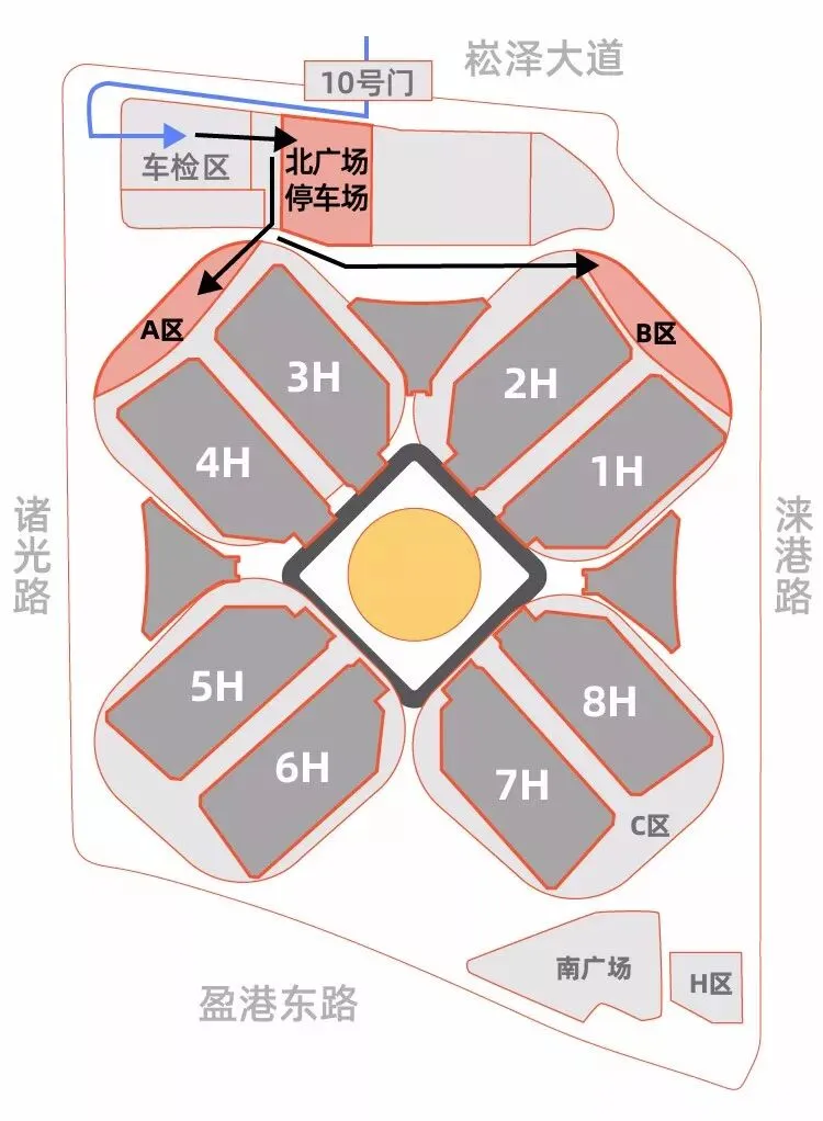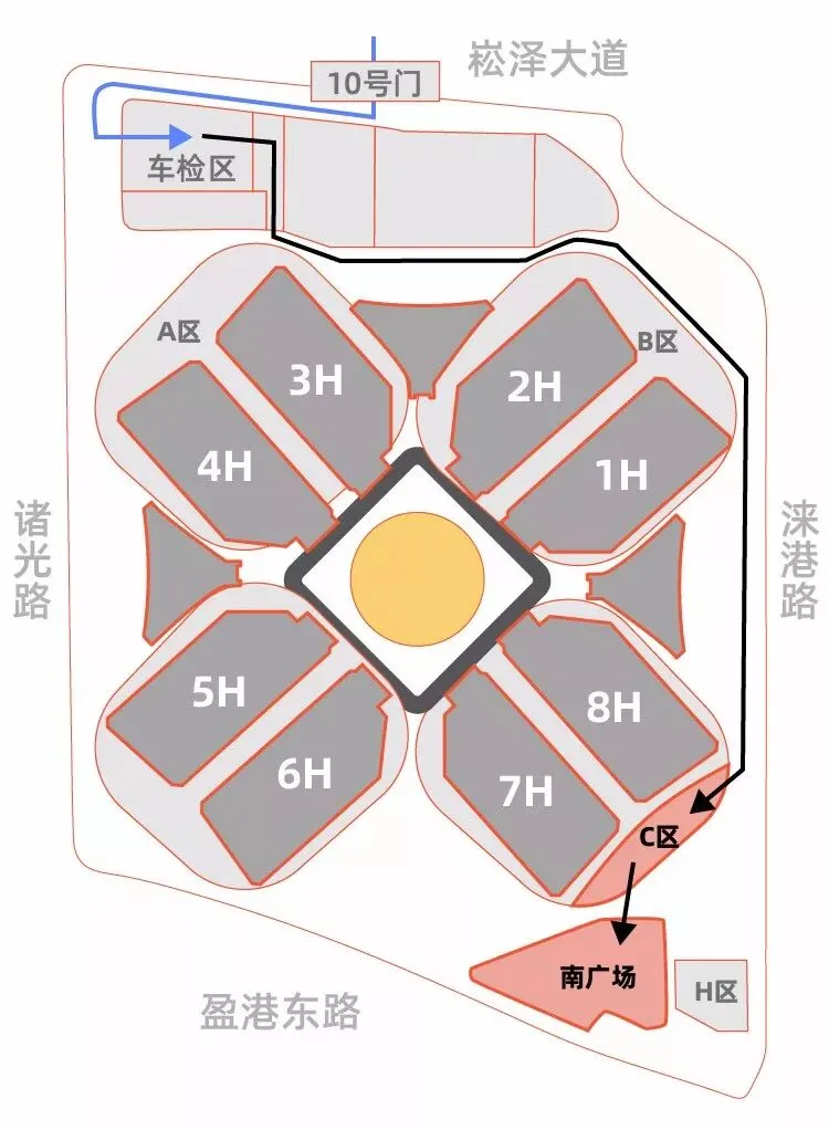 4. 南广场停车场:沿国展内部东侧中环,先进入C办公楼停车场,后从停车场内部穿行至南广场停车场。