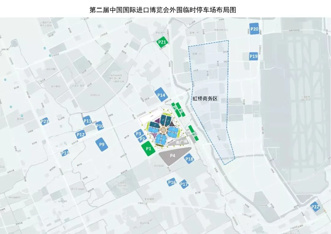 停放于 P1-4、P14、P18 等近端停车场的车辆,观众下车后自行步行至就近入口入场。停放于其余远端临时停车场和虹桥商务区停车场的车辆,观众下车后可乘坐停车场接驳线接驳至进博会 P5、P8 停车场,开行时间 8:00-20:00,发车间隔 10 分钟,客满即发,下车后经东侧二层步廊到达东厅入场。