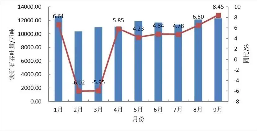 9月铁矿石进口同比增长。根据海关总署的统计数据,9月我国进口铁矿石11632.6万吨,同比增长11.72%。1-9月,我国铁矿石及其精矿进口量91768.5万吨,同比下降0.1%。