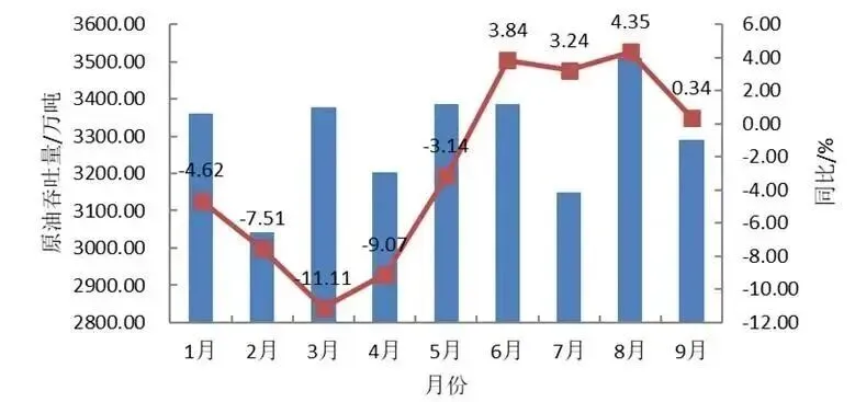 9月原油生产增速加快,原油加工较快增长,原油进口同比增长。根据国家统计局的数据,9月规上工业原油产量1777万吨,同比增长4.1%;1-9月规上工业原油产量16263万吨,同比增长1.7%;9月,规上工业加工原油6269万吨,同比增长6.8%;1-9月规上工业原油加工量55081万吨,同比增长3.7%。根据海关总署统计数据,9月原油进口量为4725.2万吨,同比增长3.9%;1-9月原油累计进口量为4.23亿吨,同比增长2.6%。