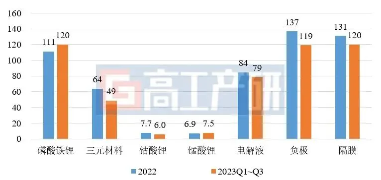 2022-2023Q1~Q3中国锂电池用主材出货量(万吨,亿平)