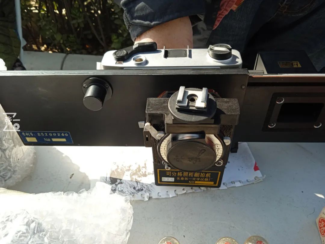 我国长春出产的“可分格照相翻拍机”,感谢老板帮我现场演示了一下具体的操作过程!前镜头应该是取自牡丹120双反的摄影镜头,不过后背上的那台135机器是什么品牌的,则不得而知了。有哪位同好知道吗?