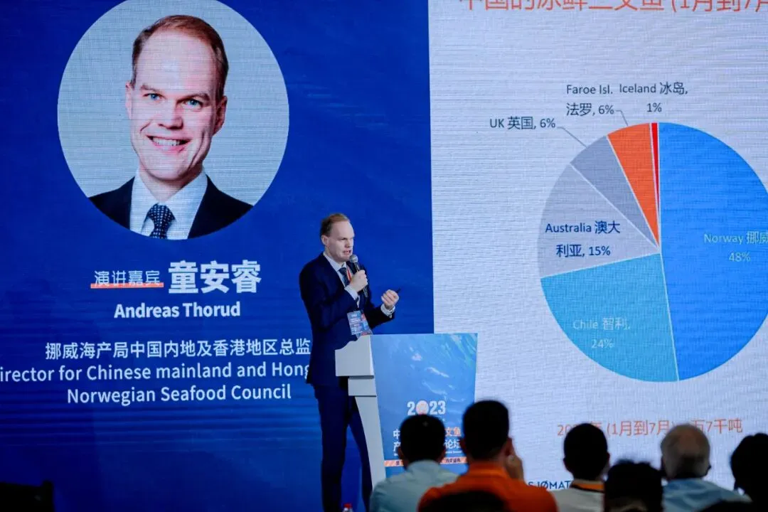 从供应量来看,2024全年度预计供应量同比将增长5%,并且不同于往年依照养殖周期,上半年供应相对紧张、下半年供应松弛的情况,2024年上半年和下半年增长幅度预计将保持同一水平,这也意味着从今年6月份到明年年底,挪威乃至全球三文鱼将保持5%的供应增幅。另外,目前受汇率、美金增值加息、供应量增加和市场饱和等因素影响,目前三文鱼价格持续且缓慢下跌。我预计今年10月份至明年4、5月份,价格会平稳且缓慢地回升到相对高点,但很难再上涨到价格峰值。Nicolás Terrazas:过去三年受疫情影响,智利产区距离中国市场比较遥远,因此过去三年,智利是受疫情影响最大的三文鱼产区之一,目前中国市场不再受疫情的影响,因此整体呈现出积极的变化,过去损失的市场份额正在慢慢恢复。