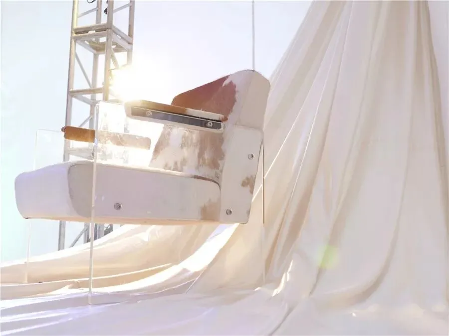 展览采用铁架作为整个展厅支撑结构,结合连续变化错落有致的大面积白色微透光布料覆盖贯穿整个空间,白色烟雾环绕空间,富有神秘感。