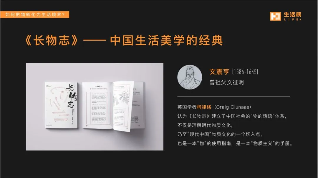 分享由一本讲述中国生活美学的经典《长物志》切入,提出重构中国生活美学,从重构人与物品的关系开始,为物品重构意义系统和场景。