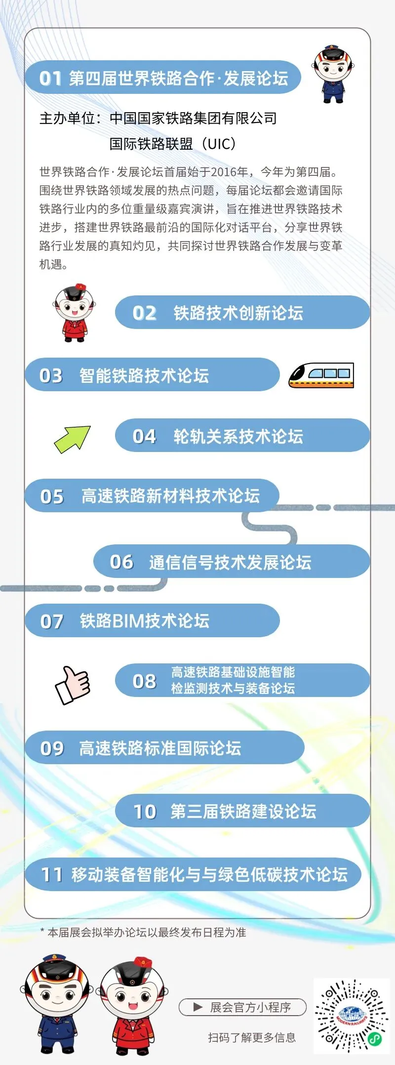展览同期,将围绕世界铁路科技创新、国际合作、智能铁路、绿色低碳等主题,举办“第四届世界铁路合作·发展论坛”等10+场高层次论坛和技术研讨会。数千名行业精英、企业高管、政府官员集结行业智慧,分享真知灼见,共谋铁路未来发展,为中国铁路科技的发展注入新的动力!