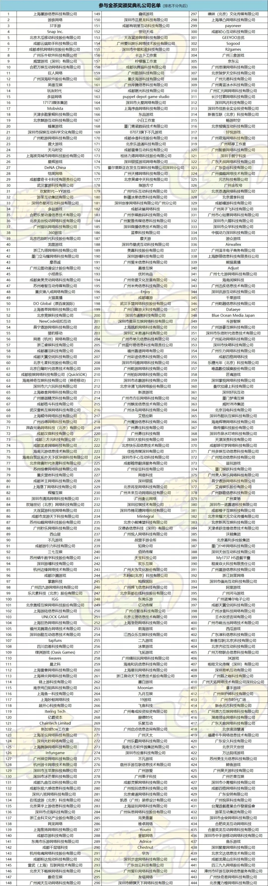 随着本届金茶奖评选、投票以及最终奖项的评定依次进行,报名参与金茶奖颁奖典礼的公司也越来越多。截至1月2日,已经有444家国内外游戏企业报名参会(目前报名公司数量仍在飞速增长,作为行业内的一员可千万不要错过机会哦,扫描文末二维码报名吧!),都有哪些业界大咖呢,本期文章将会揭晓这份名单。
