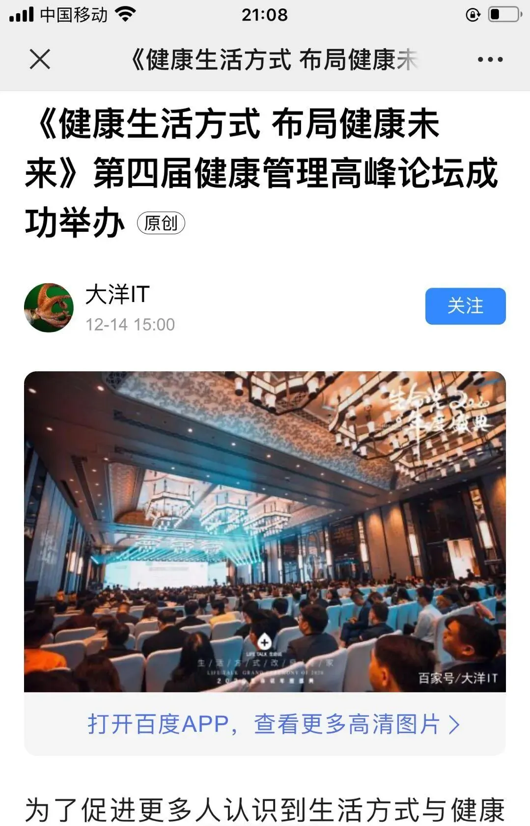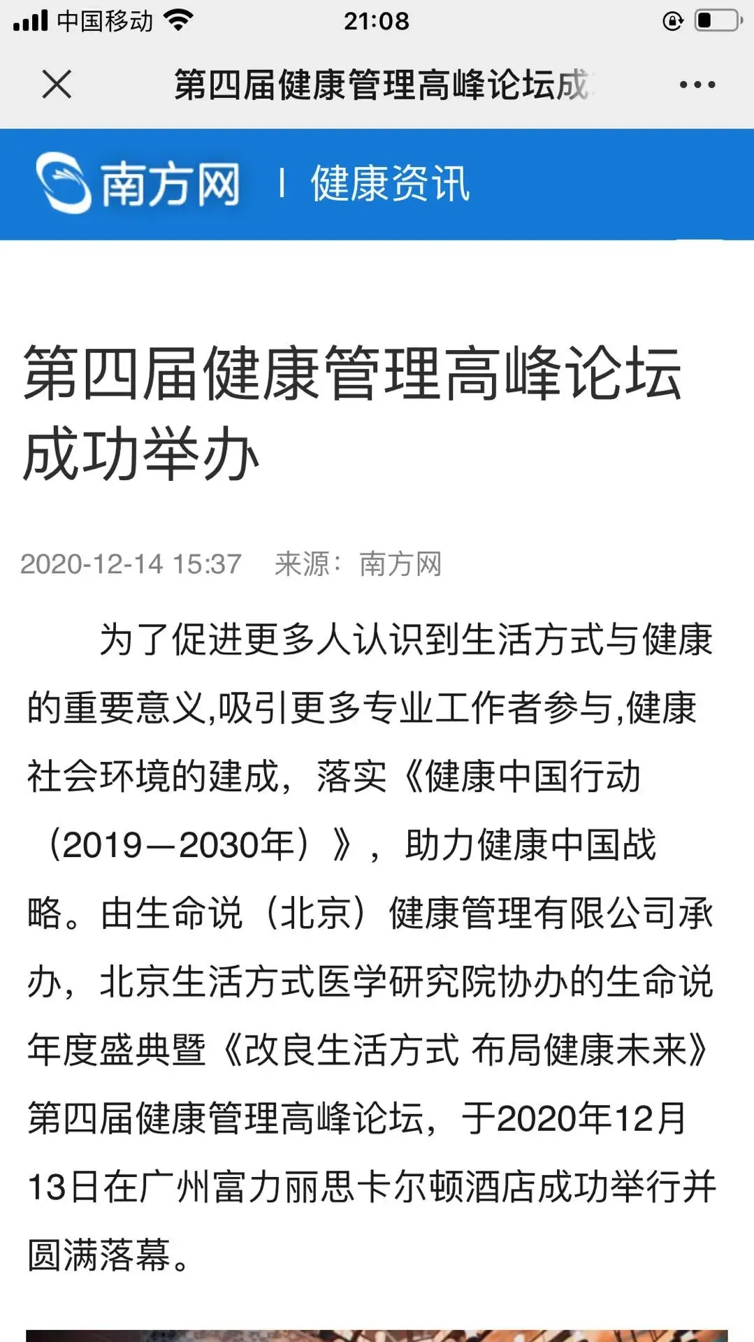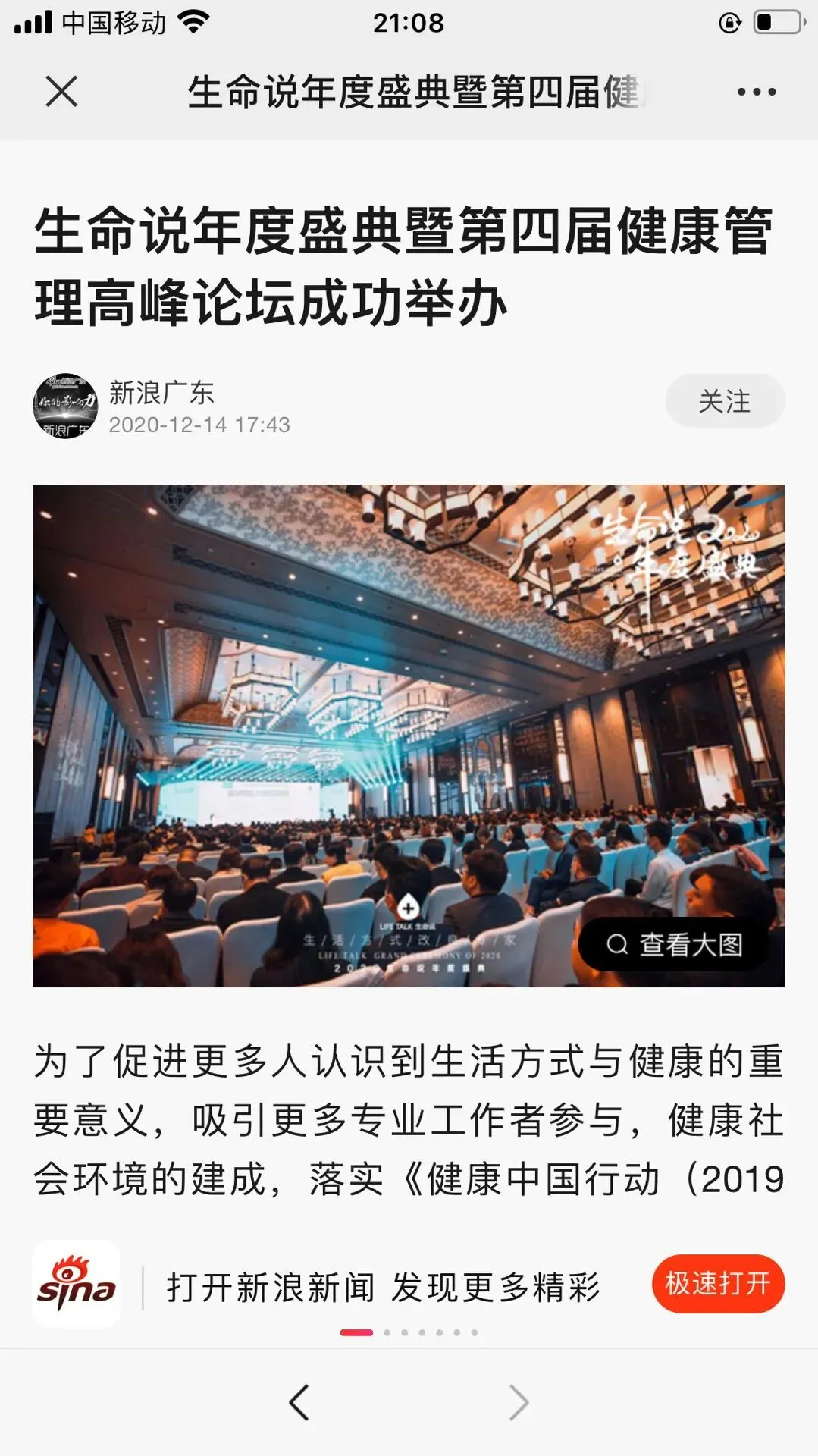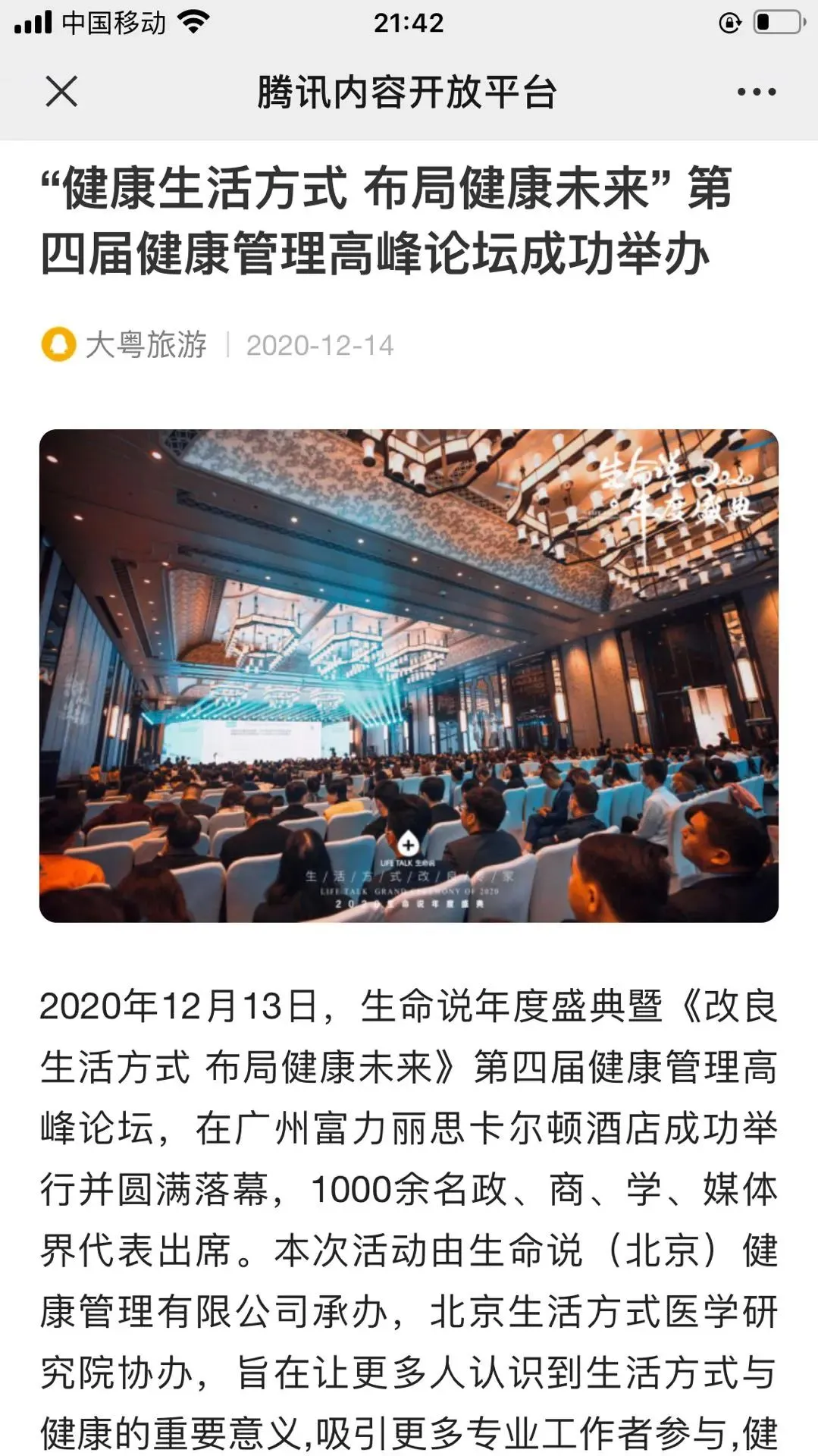 为了促进更多人认识到生活方式与健康的重要意义,吸引更多专业工作者参与,健康社会环境的建成,落实《健康中国行动(2019—2030年)》,助力健康中国战略。由生命说(北京)健康管理有限公司承办,北京生活方式医学研究院协办的生命说年度盛典暨《改良生活方式 布局健康未来》第四届健康管理高峰论坛,于2020年12月13日在广州富力丽思卡尔顿酒店成功举行并圆满落幕。1000余名政、商、学、媒体界代表出席。