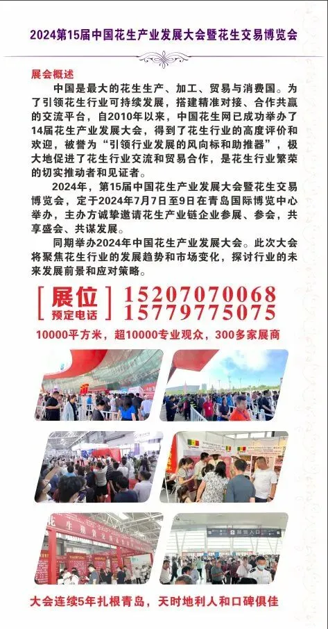 作为中国花生行业会务会展平台的开拓者,中国花生网秉承“中立、专业、专注”的原则,深耕行业十余年,自2010年主导发起“首届花生经纪人联谊会”以来,一直与花生业界企业携手奋进,砥砺前行,致力于打造花生全产业链展示平台。2024年中国花生产业发展大会暨花生交易博览会(第十五届),定于2024年7月7日至9日在青岛国际博览中心举办,我们将继续一往无前、再造盛事。历时14年的发展,每年一度的花生产业发展大会暨花生交易博览会 (以下简称花生交易博览会)已经成为业内领先的贸易展览。在中国巨大的市场需求下,花生交易博览会致力于为花生产业链相关企业打造开拓国内市场的重要平台,尤其为花生机械、花生加工、花生贸易等企业提供了一个宣传展示本企业及产品形象、开展贸易合作、拓展销售渠道的良机。我们诚挚邀请您关注、参与本届花生行业盛会!展位预订:15207070068、15779775075机械设备展区、花生食品展区、炒货食品专区、原料精准对接区、花生期货交流区、油脂企业展区、高油酸花生特色展区、辅料展区机械设备制造商:色选机、包装秤、脱壳机、码垛机器人、空压机、去石机、筛选输送设备、花生播种机、收获机、各种炒货机械、深加工流水线、食品加工机械、检测仪器设备、 喷码及耗材等;原料、食品及辅料:香精辅料、包装材料等;大中型油脂企业、食品加工企业、期货公司、花生育种供种企业、原料加工商、进出口商、贸易商、销区批发商、花生种植大户及合作社,农资、科研院所、相关行业协会、政府相关部门等。4000元/个,长3m*宽3m,总面积 9 m²。配置 : 洽谈桌一张、洽谈椅 2 个、220V/5A 电源、照明和楣板; 36㎡起步,自行搭建,一类特展收费标准为500元/m²,二类特展收费标准为400元/m²;(注:免收特装管理费、免受叉车装卸费用;特别说明:水电气需另行租用)。900元/个(桌子一张,凳子一张,背景板的设计制作);优惠政策:以上展位报价2024年5月31日前预定享受相应折扣优惠,详情请咨询会务组。特别说明:为方便各大展商的参展日程安排,我方在展馆设有相关人员对货物进行代收和调度服务!收货地址:青岛国际博览中心(青岛即墨区温泉街道温泉二路7-1号)联系人:15207070068赖经理展位预订:15207070068、15779775075