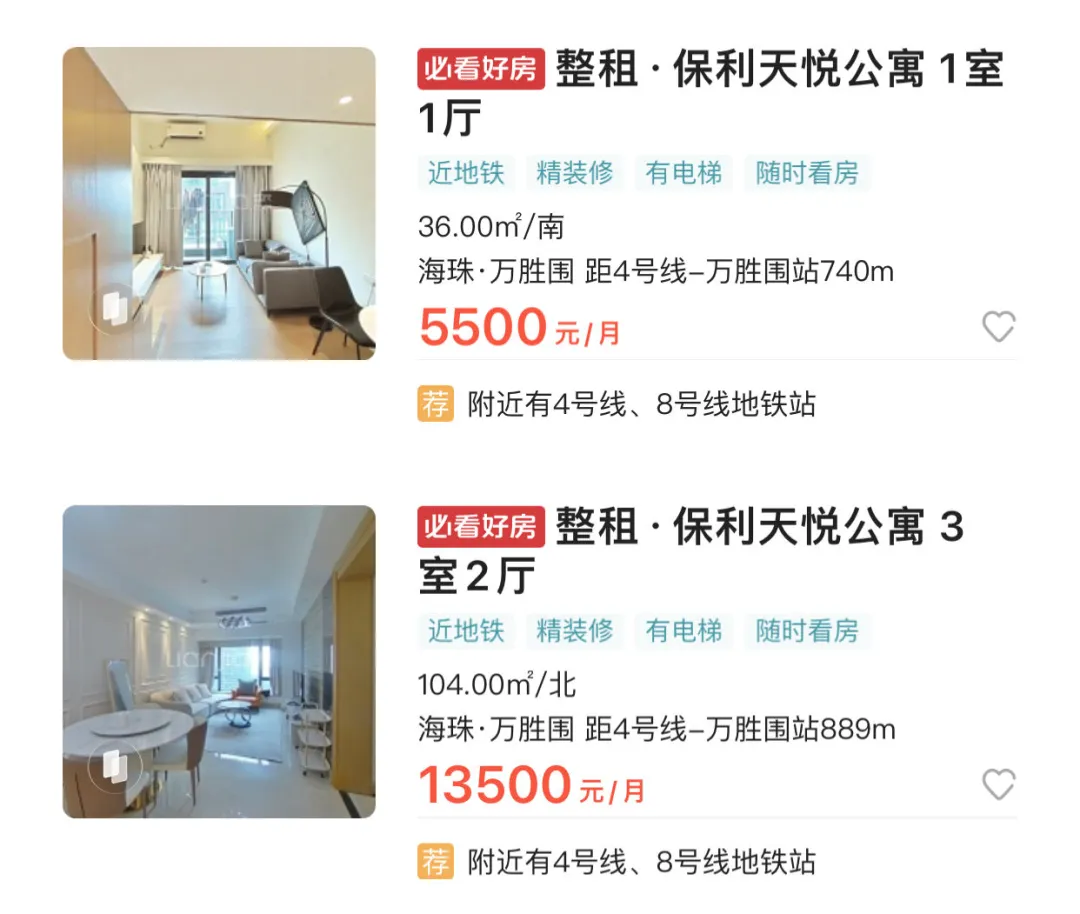 租金也跟着水涨船高,保利天悦的公寓2个月前看租金大约在5000-14000元/月左右,根据房间装修、面积大小价格不同。