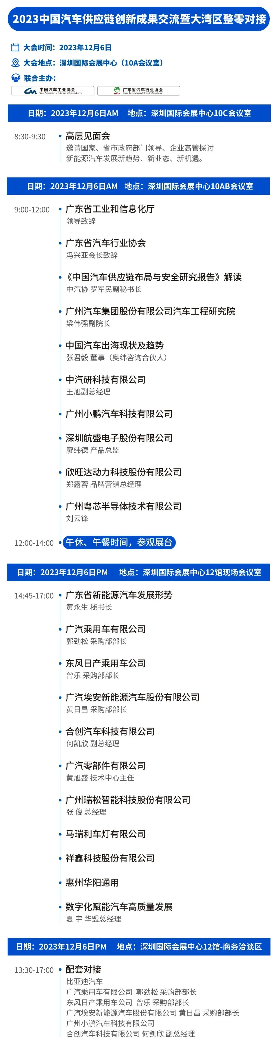 为着力推动“强链工程”, 发挥汽车产业基础优势和链主企业带动作用,提升本地化配套能力,加快构建自主高效、安全稳定的产业链供应链体系,提高大湾区汽车产业链供应链韧性和抗冲击能力,促进整车和零部件协调发展,由中国汽车工业协会、广东省汽车行业协会、英佛会议展览(上海)有限公司联合主办的中国汽车供应链创新成果交流暨大湾区整零对接会,以“创新、赋能、发展”为主题,将“展”与“会”深度结合,在专业展览现场开设主题论坛与整零推介对接会,邀请政府领导、协会嘉宾、行业大咖、企业高层、专家学者等行业精英出席。在展示最前沿科技创新产品的同时交流发展热点,剖析发展痛点,探讨发展难点,汇聚智慧,群策群议,为整零企业提供一对一的交流平台,覆盖汽车全产业链上下游,稳链补链强链控链,整合行业力量,推动中国汽车供应链做大做强。