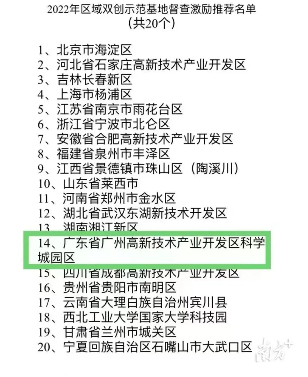 近日,国家发展改革委网站公示了2022年区域双创示范基地督查激励推荐名单,广州高新区科学城园区等20家区域双创示范基地入选。