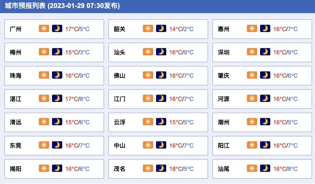 29日—30日,全省晴间多云。早晨最低气温:粤北市县零下1~2℃(高海拔山区零下5~零下2℃),珠江三角洲大部和粤东市县2~5℃,其余市县6~8℃;我省大部市县有霜(冰)冻。