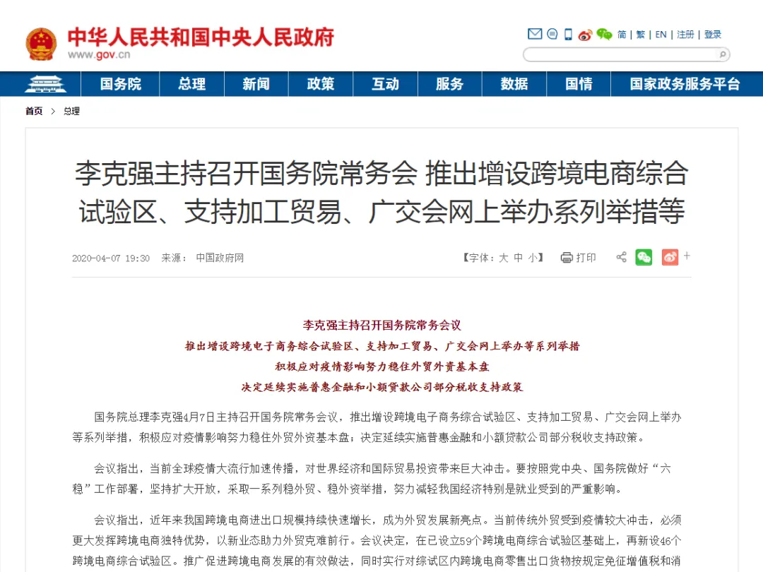 国务院总理李克强4月7日主持召开国务院常务会议,推出增设跨境电子商务综合试验区、支持加工贸易、广交会网上举办等系列举措,积极应对疫情影响努力稳住外贸外资基本盘;决定延续实施普惠金融和小额贷款公司部分税收支持政策。