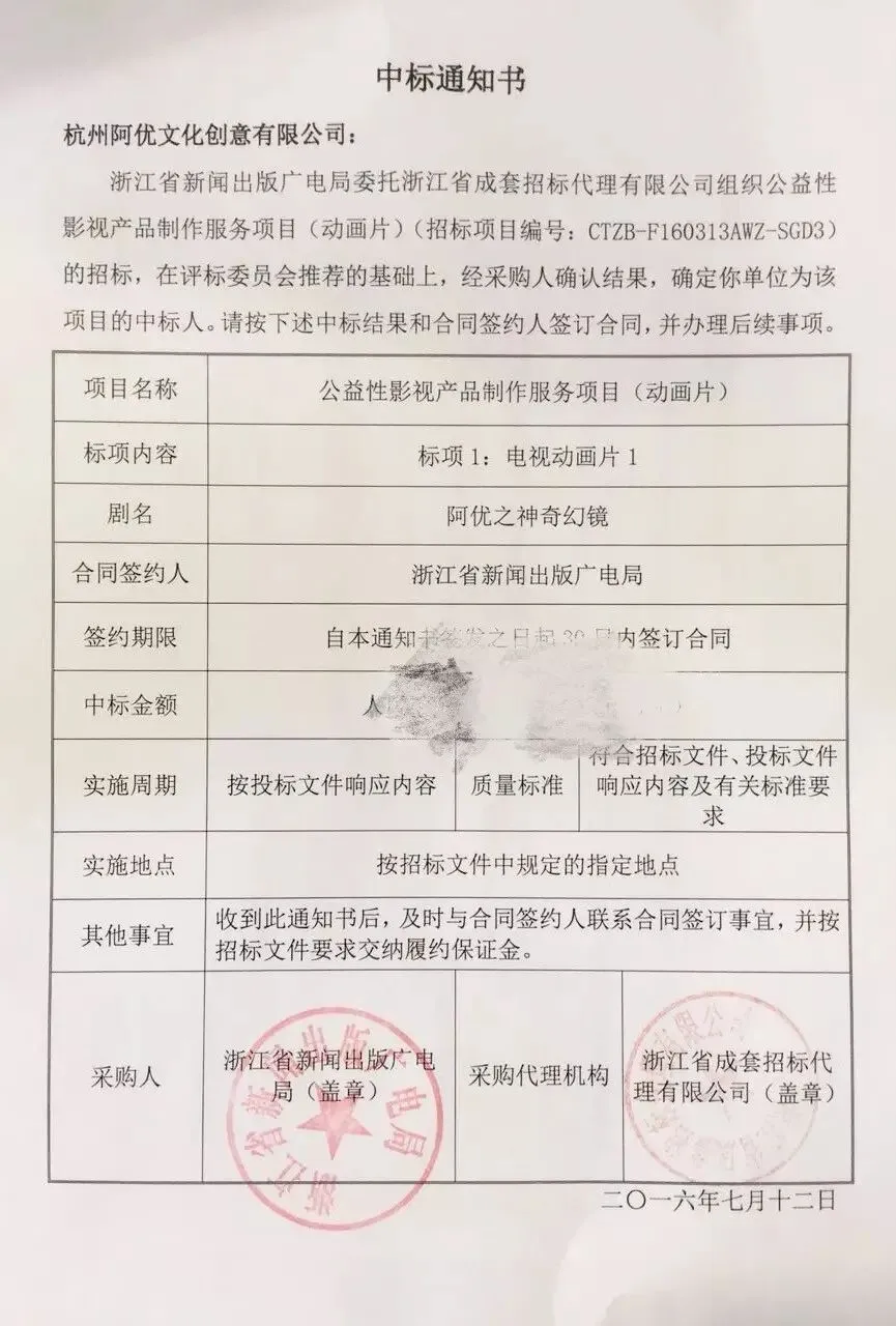 ►上周,《阿优之神奇幻镜》以其“为成长加优”积极向上的核心价值观和绿色健康的内容,经过严格评审后,以83.34的小组最高分获得中标,被浙江省新闻出版广电局选为公益性影视产品服务项目的内容供应商。