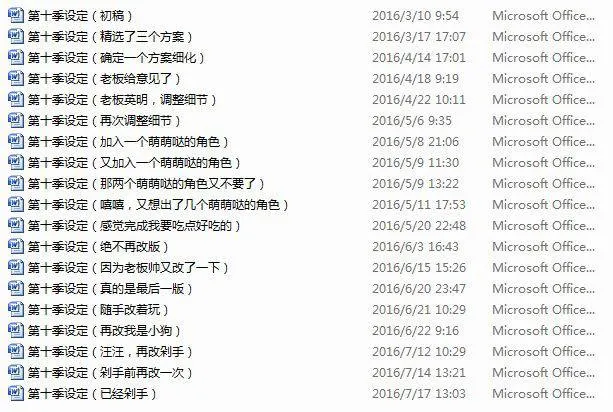 ►而这一切都源于:一直以来我们始终相信动漫作品,对孩子的性格和一生的潜移默化的影响!在一部作品正式面对观众之前,它会经历一遍一遍的斧凿、打磨、纠错、优化。而源头的脚本创作,我们的态度是认真,甚至是苛刻的!从下表的截图可以看出,一个剧本的打磨,数十遍、数月的推翻、修改、重写……蟹要脱壳,蛇要蜕皮,创作的匠心也是需要如此的蜕变,坚持与放弃本来就是一对矛盾统一体,而我们需要的就是学会在放弃中成长!