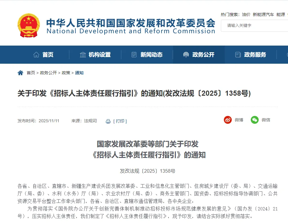 2025年10月29日,国家发展改革委、国务院国资委、国家工信部等部门联合印发了《招标人主体责任履行指引》(发改法规〔2025〕1358号,以下简称《指引》),旨在进一步压实招标人在招标投标活动中的主体责任,规范招标行为,提升招标质量和效率,促进招标投标市场健康有序发展。《指引》自2026年1月1日起正式实施,是贯彻落实《国务院办公厅关于创新完善体制机制推动招标投标市场规范健康发展的意见》的重要配套文件,对依法必须招标项目(特别是使用国有资金或国家融资的项目)具有重要指导意义。