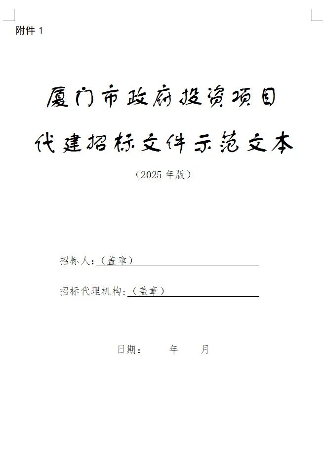 关于发布政府投资项目代建招标文件及合同等示范文本的通知 根据《厦门市人民政府关于印发政府投资项目代建制管理办法的通知》(厦府规〔2023〕11号),市住建局结合实际,制定了《厦门市政府投资项目代建招标文件示范文本(2025年版)》《厦门市政府投资项目代建合同示范文本(2025年版)》等2个文件,现予以发布,供各相关单位使用。 本通知于2026年3月1日起施行,《厦门市建设局关于发布厦门市政府投资项目代建招标文件及合同等示范文本的通知》(厦建协〔2023〕17号)同步废止。 1.厦门市政府投资项目代建招标文件示范文本(2025年版) 2.厦门市政府投资项目代建合同示范文本(2025年版)