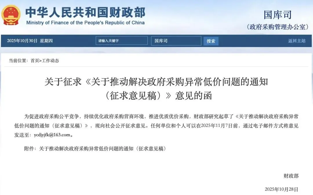 10月28日,中华人民共和国财政部国库司在官方网站上发布了《关于征求《关于推动解决政府采购异常低价问题的通知 (征求意见稿)》意见的函》: