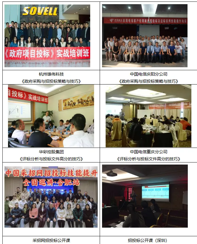 ● 曾为上海证券交易所、中国银联、中国移动、中国电信、中国联通、中国铁塔、惠普(中国)、平安集团、中国人保、工商银行、招商银行、邮储银行、中广核集团、国家能源集团、国家电网、平高集团、汇源通集团、国电南瑞集团、中铁物资集团、中国电子科技集团、华彩控股集团、中建一局、中建四局、中建七局、中铁二局、中化七建、中国中车、广汽集团、一汽大众、新华三集团、华为技术、中交四航局、中交水利、长江建设、苏交科集团、三一重工、中联重科等多家上市公司及集团型企业提供政府采购与招投标项目的指导与培训,通过系统性的知识串联,提供专业的招投标营销工具和方法,提升企业参与政府采购及招标投标项目的能力及成功率,课程满意度高达95%以上,深受企业认可。