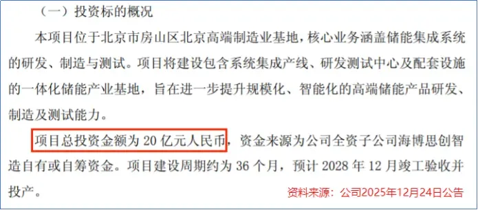 12月24日,“储能集成第一股”海博思创发布公告称,其全资子公司海博思创智造拟投资建设“海博思创智能绿色储能工厂项目”,总投资额预计20亿元。