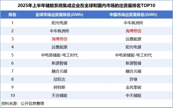 根据公开数据,海博思创2025年上半年位列全球储能系统集成商前三强,在出货量排名中稳居全球第三,国内第二。