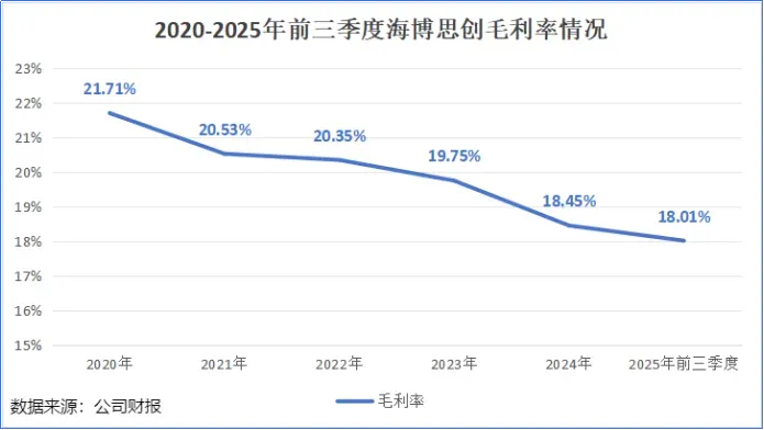 海博思创的毛利率也不可避免地受到侵蚀。数据显示,2020-2025年前三季度,公司毛利率从21.71%一路下滑至18.01%。