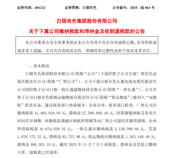 白银有色集团三家子公司在“双随机”税务检查中呈现截然不同的结果:
