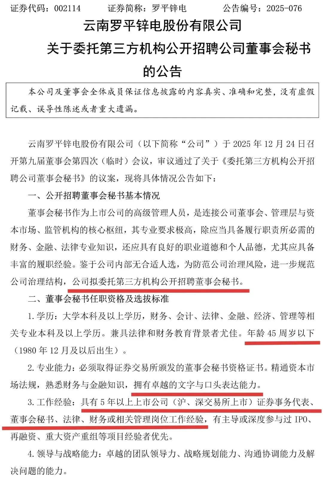 这家深圳主板上市公司在公告中坦承,董事会秘书职位因“公司内部无合适人选,为防范公司治理风险”而需对外招聘。这种将高端人才招聘细节通过正式公告披露的做法,在A股市场颇为罕见。2025年12月24日,罗平锌电召开第九届董事会第四次(临时)会议,一次性审议通过了关于委托第三方机构公开招聘两位关键高管的议案。公开招聘董事会秘书的直接原因是“公司内部无合适人选”。公告强调,这一职位作为连接公司董事会、管理层与资本市场、监管机构的核心枢纽,“专业要求极高”,需具备财务、金融、法律专业知识及丰富的履职经验。对于生产副总经理职位,公司则希望通过公开招聘引进具备先进管理经验和精益生产经验的优秀人才,利用外部视角审视公司现有流程,推动生产管理变革。这次公开招聘发生在公司控制权变更和董事会换届后不久。2025年10月,罗平锌电完成第九届董事会换届选举,控股股东已变更为曲靖市发展投资集团有限公司,实际控制人相应变更为曲靖市国资委。在新组建的第九届董事会中,肖力升当选为董事长并被聘任为公司总经理,同时公司还聘任了陈恪锦、李志敏两位副总经理。公司治理架构已基本搭建,但董事会秘书及生产副总经理这两个关键职位出现空缺,亟需补齐。两份公告详细列出了近乎苛刻的任职资格要求,显示了公司对这两个职位的高度重视。董事会秘书候选人必须持有证券交易所颁发的董事会秘书资格证书,年龄需在45周岁以下,并拥有5年以上上市公司证券事务、法律或财务相关工作经验。生产副总经理的要求更为专业,应聘者需具有10年以上有色金属冶炼行业经验,其中5年以上需在铅锌冶炼企业担任生产厂长、生产总监或以上职务,且必须精通锌冶炼至少一种主流工艺全流程。根据公告,本次公开招聘将遵循严格的公司治理程序。董事会已授权提名委员会或指定工作小组负责组织实施,同时授权管理层选聘第三方专业机构完成具体招聘工作。后续,董事会将根据提名委员会提交的人选提案及相关评估材料召开会议审议聘任。聘任通过后,公司将及时履行信息披露义务,公告聘任情况。这一透明化的招聘流程,体现了公司在新的国资控股背景下对规范治理的重视。你在看就点这里吧
