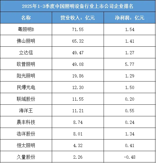 根据东财行业分类,2025年1-3季度中国照明设备行业上市公司企业排名如下:(A股上市公司)