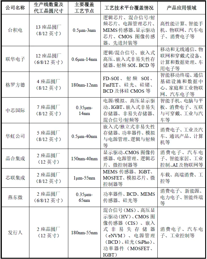 公司与同行业可比公司均主要从事晶圆代工业务,但在细分产品种类、产品构成及工艺制程等方面与可比公司存在一定程度差异。