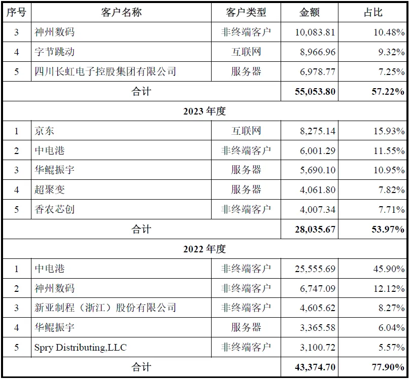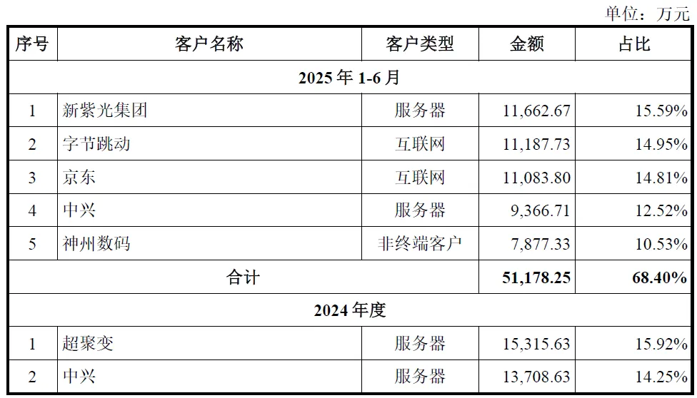 主要客户:公司已覆盖的下游客户和最终使用方包括: Google、字节跳动、腾讯、阿里巴巴、京东、百度、美团、快手、Deepseek、小红书、滴滴等国内外头部互联网、云计算和 AI 企业,新华三、超聚变、中兴、华鲲振宇、联想等国内头部服务器厂商,中国电信、中国移动、中国联通等三大通信运营商,金融、电力及其他行业知名企业。