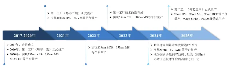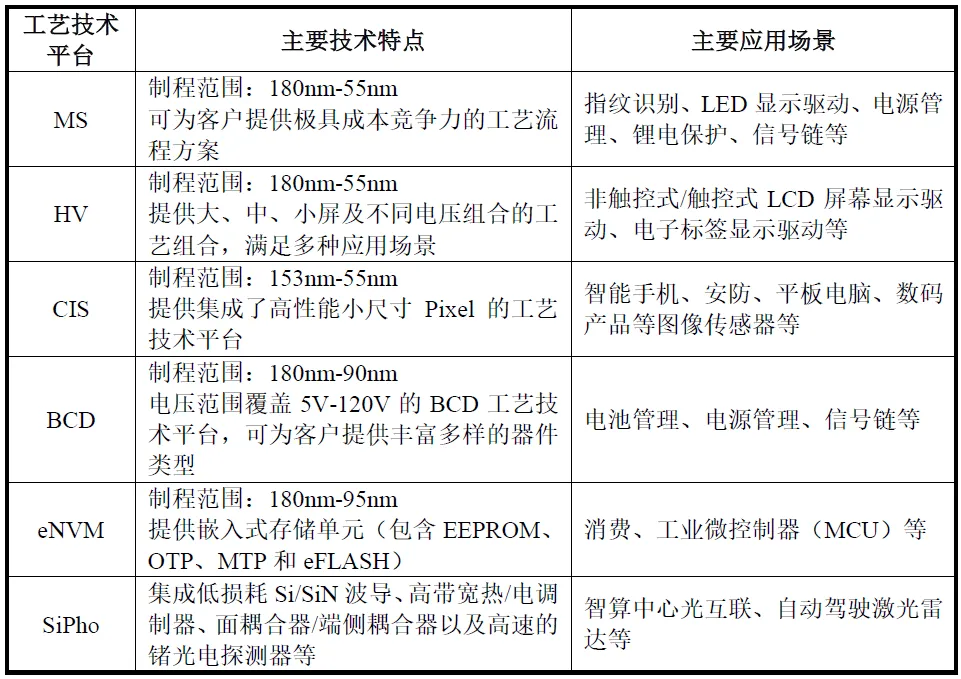 发展历程:公司目前已实现180nm-55nm制程节点的12英寸晶圆代工平台的量产,已具备 MS、HV、CIS、BCD、eNVM、MOSFET、IGBT、SiPho等工艺技术平台的生产能力。在不同发展阶段,公司主要制程及工艺技术平台的演进情况如下: