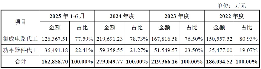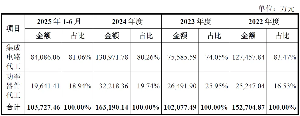收入构成:报告期各期,公司主营业务实现的收入分别为152,704.87万元、102,077.49万元、163,190.14万元和103,727.46万元,由集成电路代工及功率器件代工业务构成。公司按照工艺技术平台分类的主营业务收入构成如下:
