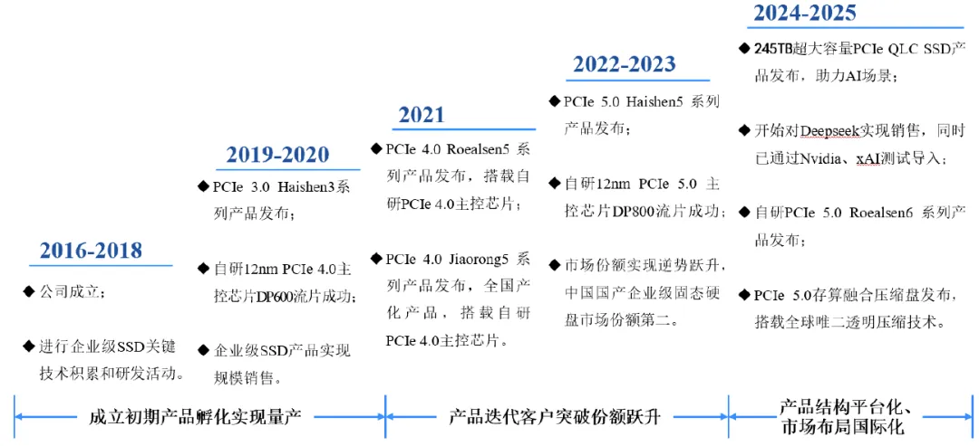 发展历程:自成立以来,公司紧跟最新闪存技术和接口协议的发展趋势,专注于主营产品企业级SSD的代际更新和性能升级,对自研主控芯片不断迭代优化,产品结构不断丰富,已实现PCIe 3.0到5.0代际的产品全覆盖,主营业务收入规模稳步增加。