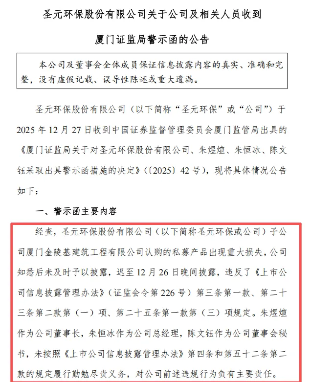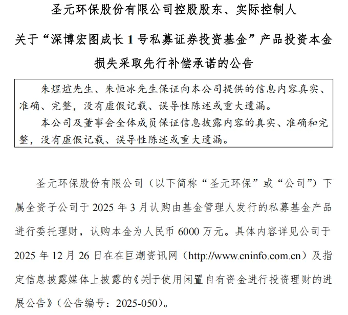 12月27日晚,圣元环保(300867)连发两则公告,就6000万元私募理财巨亏事件披露最新进展:公司及三位核心高管因未及时披露重大损失,收到厦门证监局警示函;同日,公司控股股东、实际控制人朱煜煊与朱恒冰,承诺对投资本金损失进行先行补偿,最大限度保障公司及股东利益。