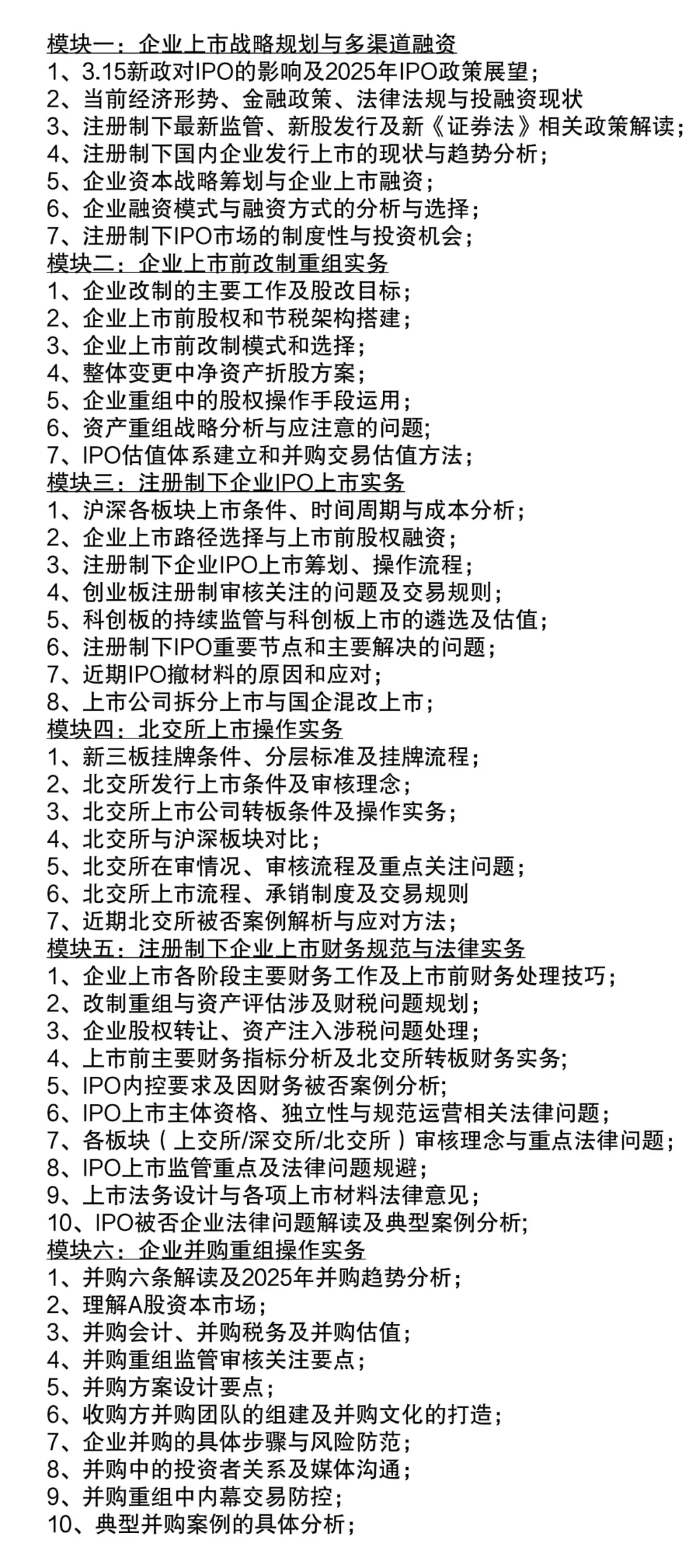 为帮助企业及相关机构全面了解我国资本市场的最新政策,掌握新形势下企业发行上市、并购重组等资本运营的重点难点问题,制定企业最佳上市融资方案和并购重组方案,深入了解监管要求,做好全过程规范运作,实现企业与资本成功对接!为此,中融商学将于1月深圳继续举办第83期“注册制下企业IPO上市及并购重组实务操作培训班”。