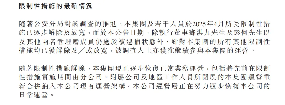 截至该公告日,除了公司董事长、创始人邓洪九、董事彭何以及其他两名管理层成员仍处于被逮捕状态外,公安机关针对公司人员的其他限制性措施均已获解除、放宽,被调查人士获准继续参与公司运营;公司董事兼总经理江宗英已经恢复办公。