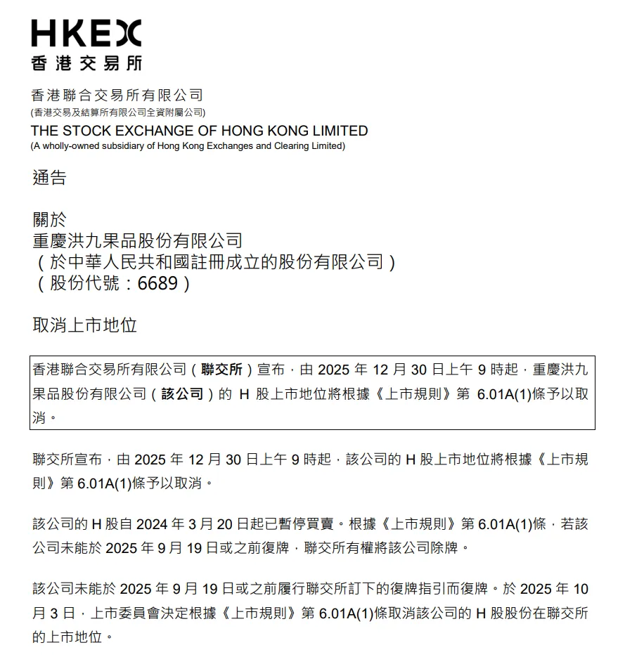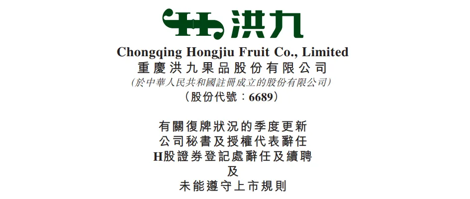 此前,因洪九果品未能在9月19日之前复牌,港交所在10月3日作出了取消公司上市地位的决定。公司曾于10月13日申请复核,但港交所称,上市复核委员会维持取消公司上市地位的决定。
