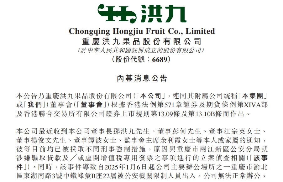 2025年4月16日,洪九果品公告称,因重庆市两江新区公安分局就涉嫌骗取贷款、虚开增值税专用发票等事项立案调查,公司董事长邓洪九、董事彭何、江宗英、杨俊文、谭波,以及监事会主席余利霞被采取不同刑事强制措施。同时,该事件导致自2025年1月6日起,洪九果品主要办公场所之一重庆市渝北区东湖南路3号中铁峰汇B座22层被公安机关限制人员出入,公司无法正常办公。
