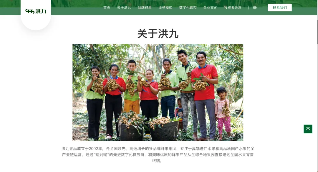 公开资料显示,洪九果品成立于2002年,是一家专注于高端进口水果和高品质国产水果全产业链运营的多品牌鲜果集团。公司通过“端到端”数字化供应链,将鲜果产品从全球各地果园直接送达全国水果零售终端。