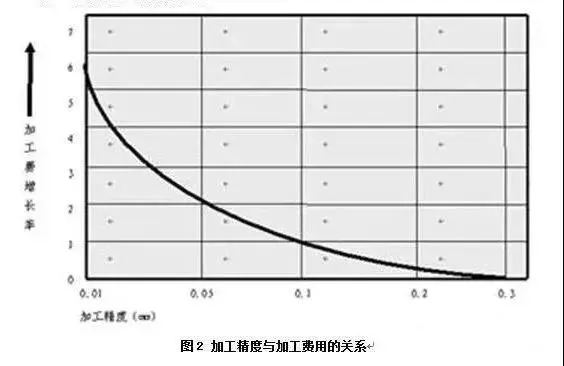 如图2所示,随着加工精度的提高,加工费用会呈指数增长。当精度提高到一个数量级,就意味着使用的设备等级越高。