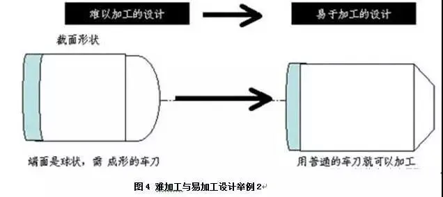 如图4所示,设计一个截面,本来的设计是圆形截面,如果把该零件的截面设计成圆形,就要开发专门刀具,这样成本就会很高;而把它的截面设计成梯形之后,就很容易制造了。