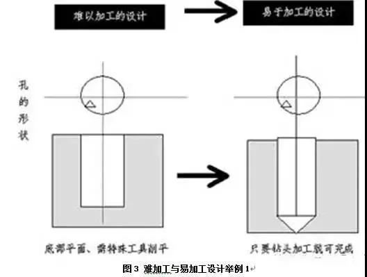 如设计某产品,其底部是一个非常平的孔,产品成本就很高,但把它设计成平的,必须用到特殊的处理方法。如果该产品的底部是平的,就需要用特殊的工具削平,而如果把它的底部设计成三角形,只要使用钻头打孔,而不需要其他特殊处理,图3所示。